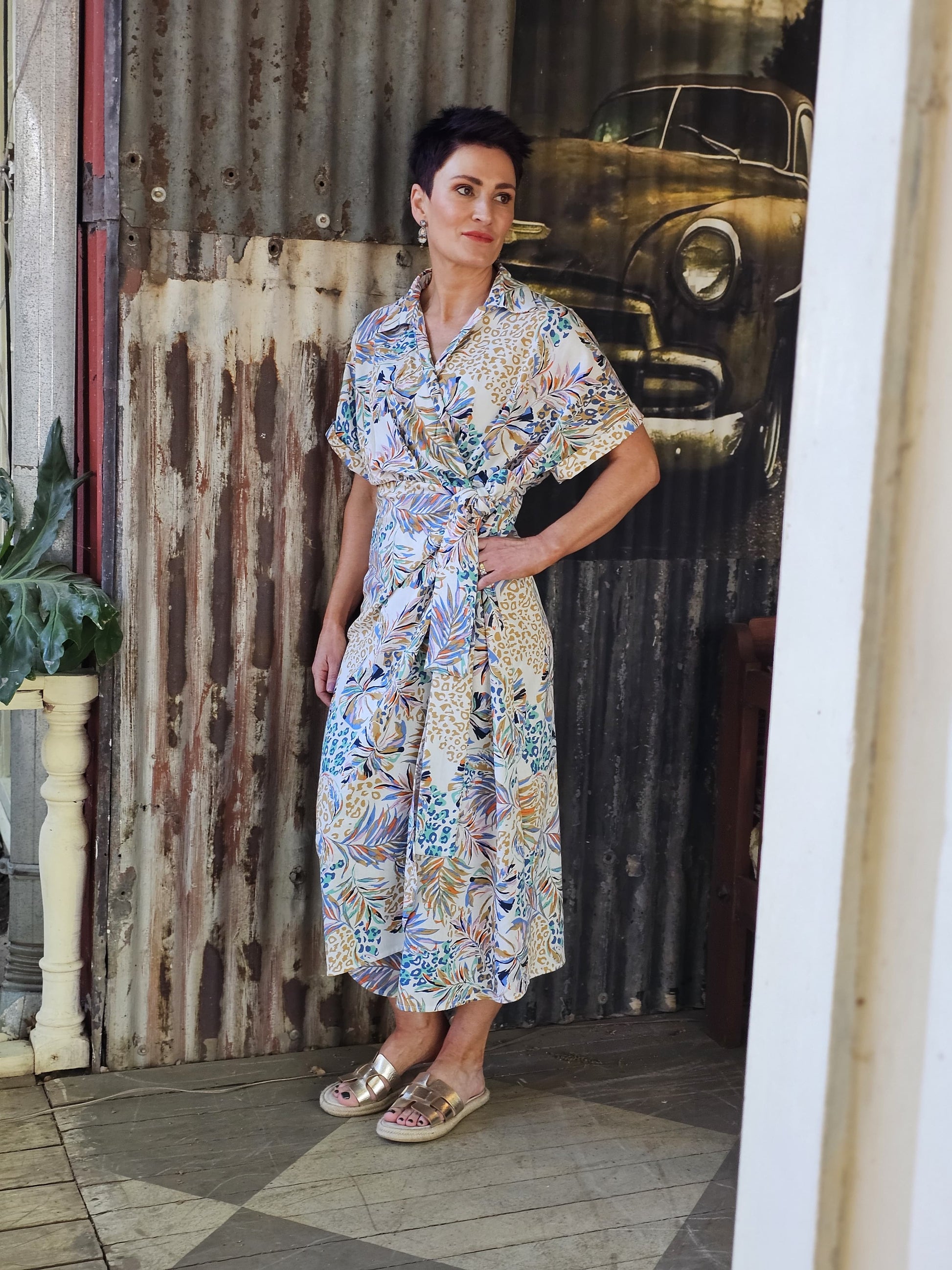 Mid length wrap dress with a collar and short sleeves.