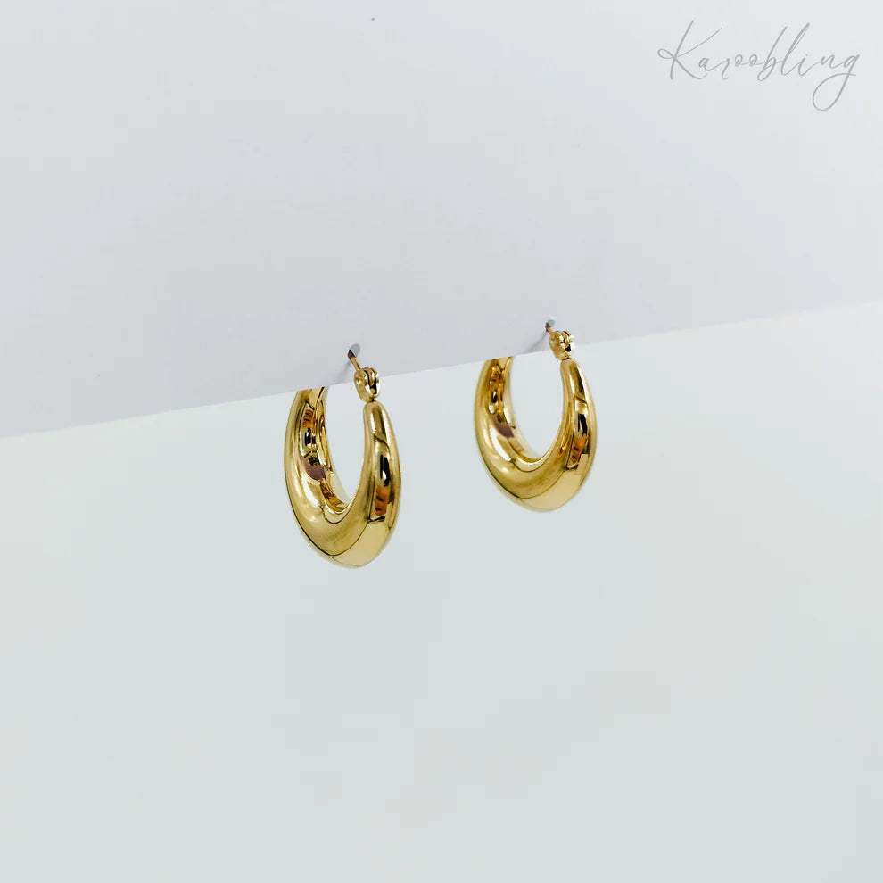 Crafted from stainless steel and finished with a thick layer of 18K gold plating, these hoops are lightweight, water and tarnish proof, and designed for all-day comfort.