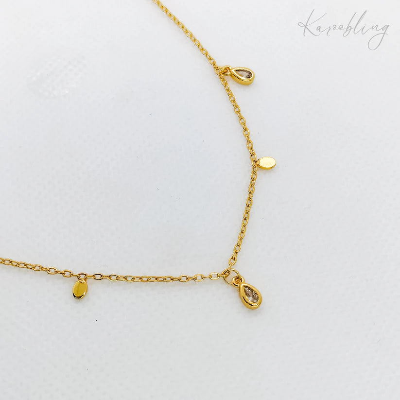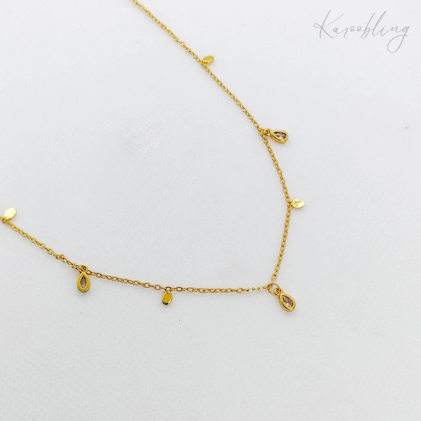 This necklace features a finely crafted, delicate chain adorned with alternating teardrop charms in two unique styles. The smaller teardrops have a smooth, flat finish, exuding a minimalist allure, while the larger teardrops showcase a beautiful teardrop-cut cubic zirconia's in the center.