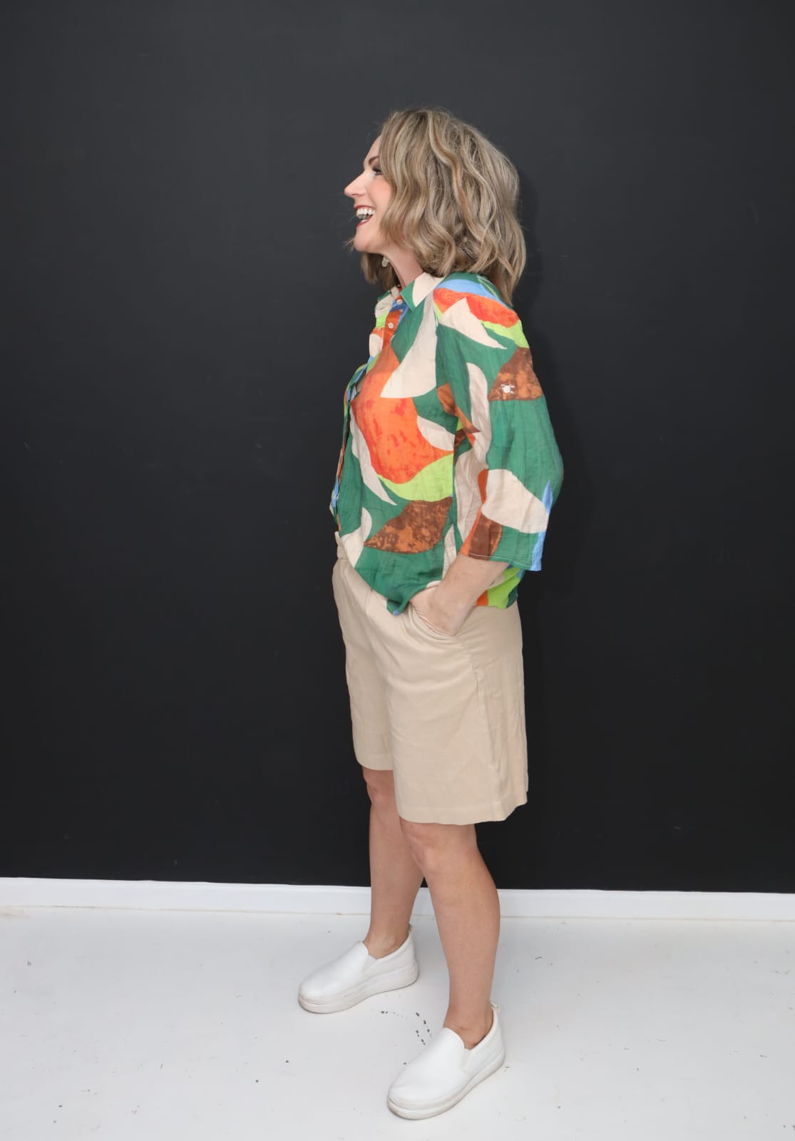 Description : Beautifully printed blouse . Adjustable sleeves that can be folded up and buttoned to shorten. Button down front... Read more
