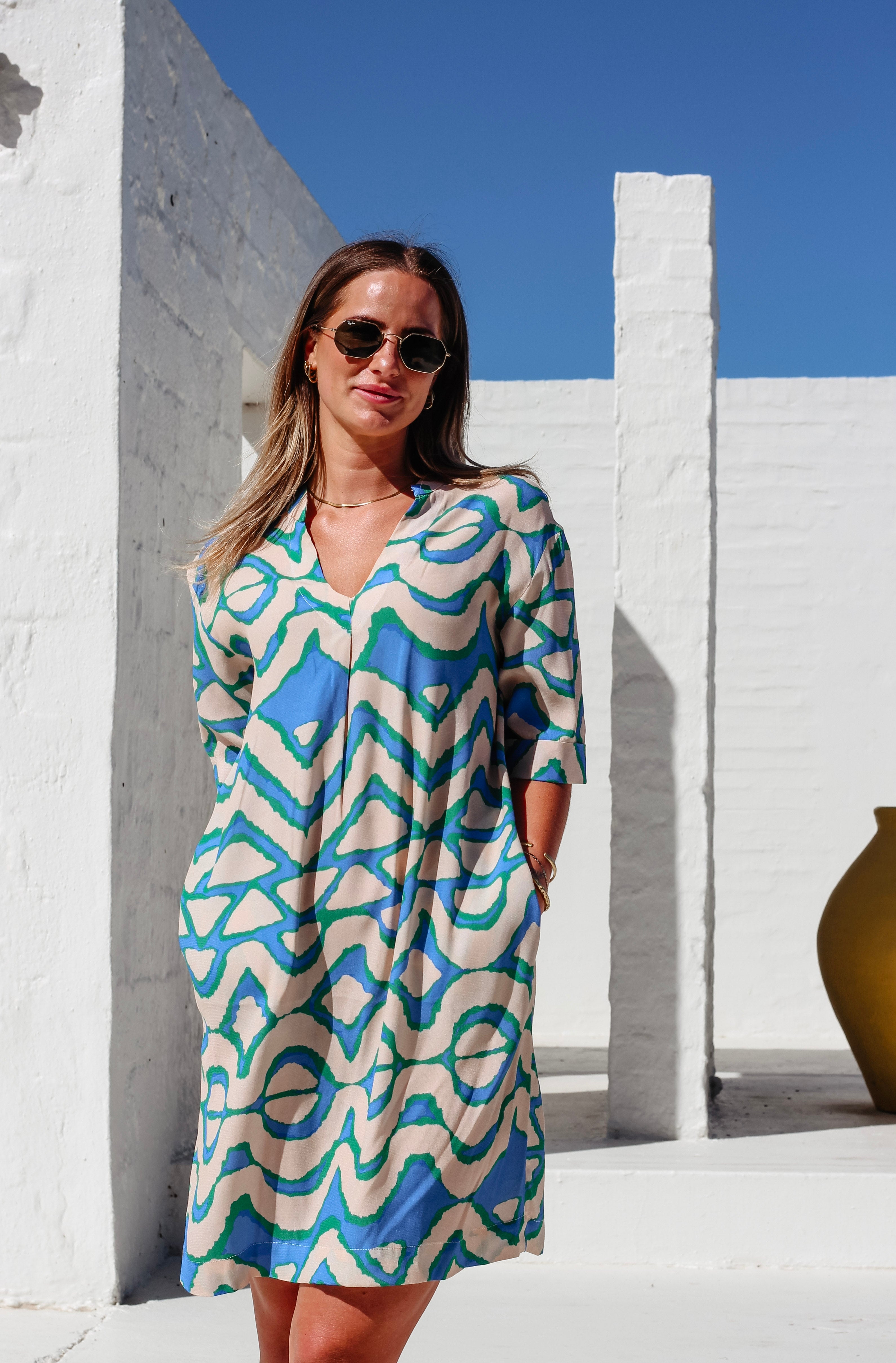 Description : Elegant tunic style dress in a blue aqua print, featuring a soft mandarin collar .This is a knee... Read more