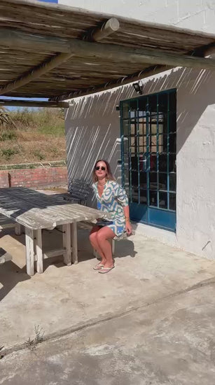 Elegant tunic style dress in a blue aqua print, featuring a soft mandarin collar .This is a knee length dress with 3/4 sleeves.