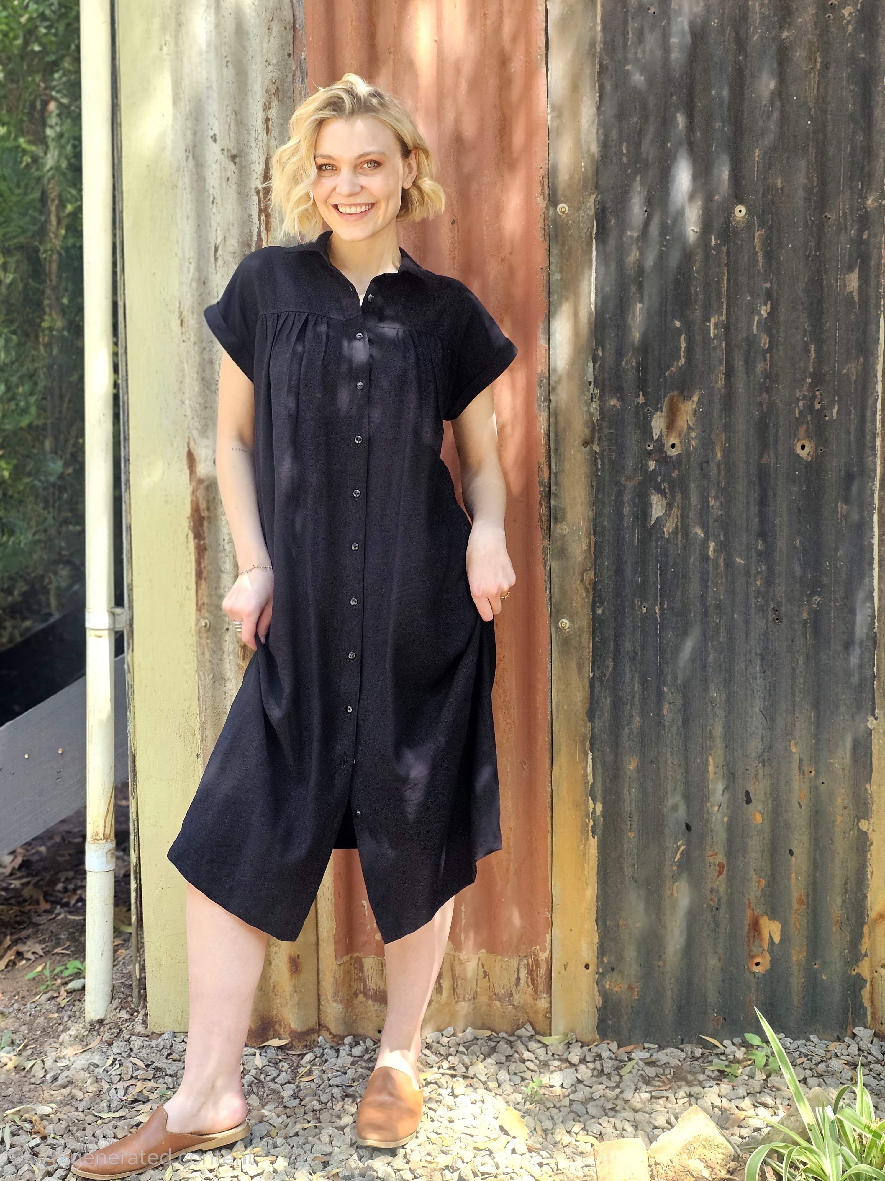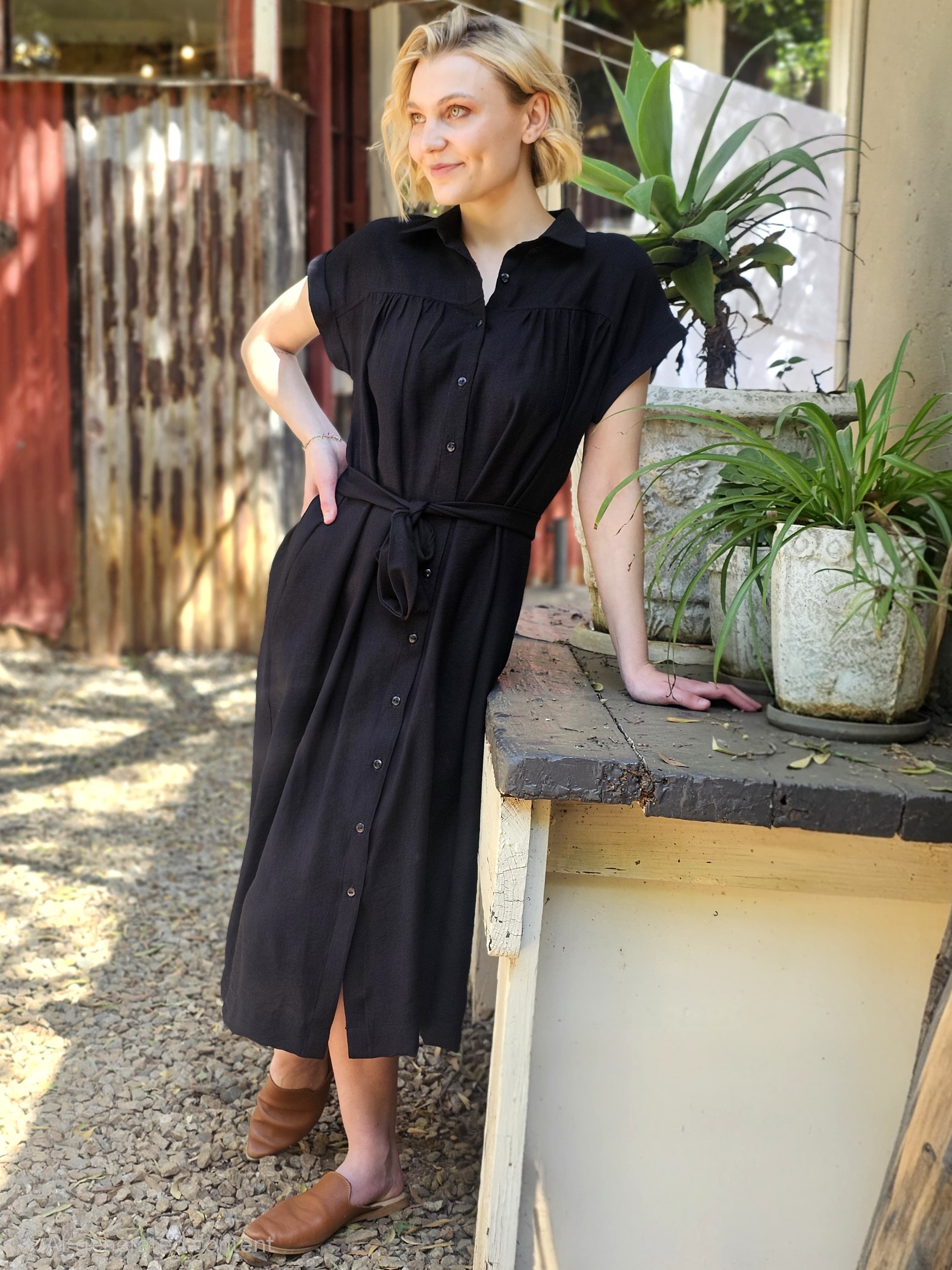 Description : A flattering button through, gathered midi short sleeve dress. Comes with a self belt - allowing different styling... Read more